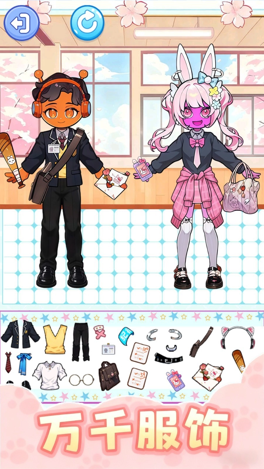 1. 游戏以虚拟校园环境作为换装背景,其中包含了教室走廊、社团活动室与校园花园等诸多经典场景。