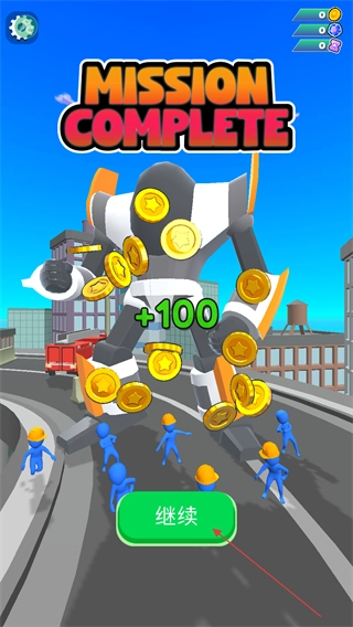 4、通过关卡后会出现MISSION-COMPLETE的提示,并且能得到金币奖励,点击继续按钮即可进入下一关,积攒的金币可用于后续的养成环节。
