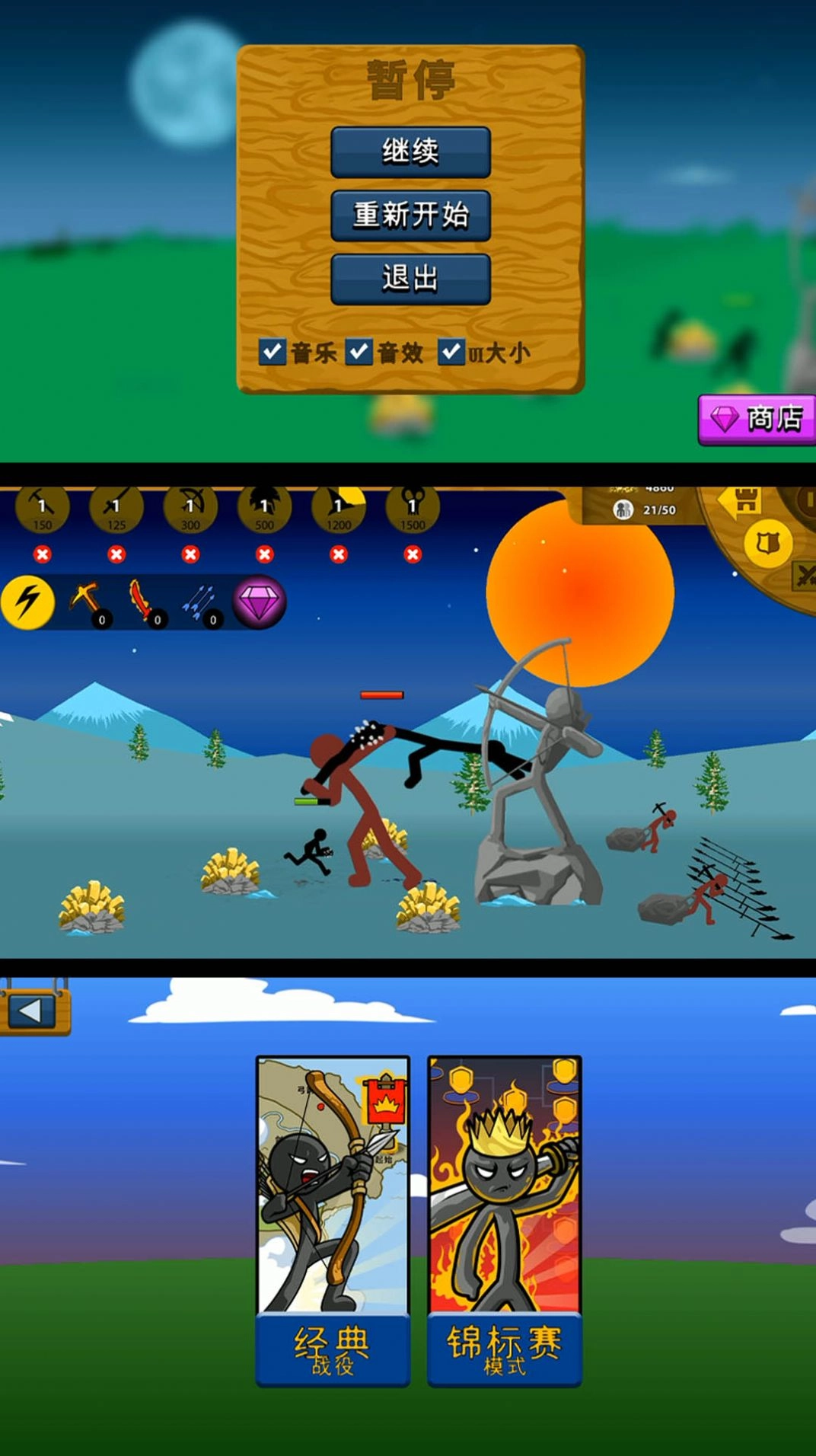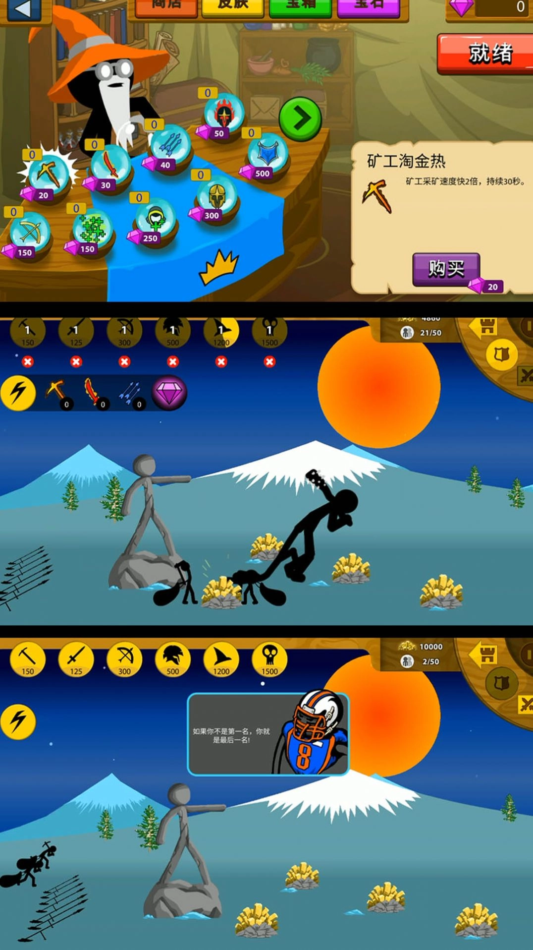 3、武器装备:对武器装备进行强化,打造各式各样的武器,解锁更强大的战斗力,同时结合每种武器的特性,组建出终极的火柴人军队。