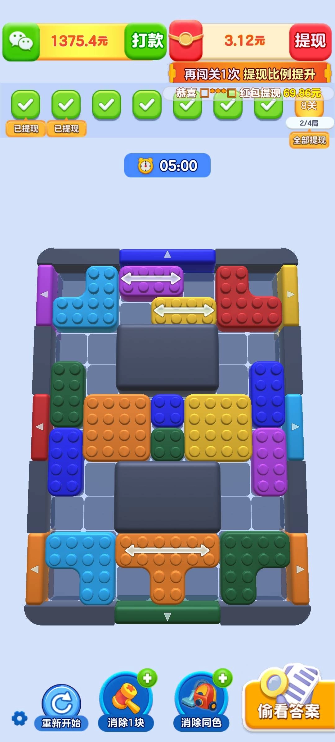这是一款只需简单挪动方块就能完成消除的闯关游戏。游戏关卡里有各种颜色的方块,玩家拖动一下就能轻松消除,还能使用道具让消除过程更高效。
