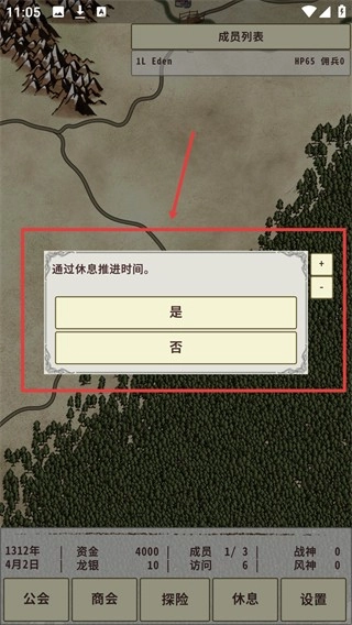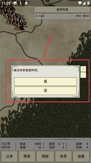 4、在地图界面点击“休息”选项,然后选择“是”来推进时间,这样做既可以帮助恢复角色状态,也可能触发新的事件。