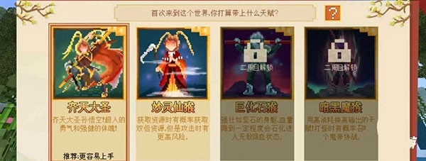 3、另外,在大闹天宫玩法里也设有多种天赋可供挑选,像齐天大圣、妙灵仙猴、巨化石猴、暗黑魔猴都包含在内。这当中,齐天大圣很适合新手选择,操作起来简单易上手;妙灵仙猴在收集资源的过程中,有机会得到双倍的资源奖励,但在发起攻击时面临的危险会更大;巨化石猴得等开启二周目后才能解锁,当它的血量下降到特定数值时,就能进入无敌且自动回血的状态;暗黑魔猴同样需要完成一周目开启二周目后解锁,在攻击怪物的时候,有一定概率召唤出鬼王来并肩战斗。