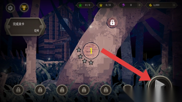 1、画面展示森林场景,包含“完成关卡0/4”提示、“1”号关卡选项、【开始】按钮,界面上方设有资源显示区域,此外还有设置、成就等功能图标,整体构成关卡选择界面的实体内容。
