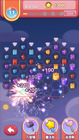 1、把三个及以上同色的烟花依次连在一起,排在最后的那一枚就会被点燃并发生爆破,不仅能清除该区域的障碍物,还能得到对应的积分奖励。