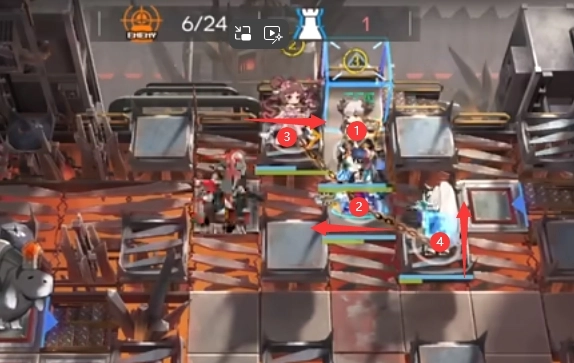 随后按照图示顺序进行部署:塞雷娅 → 煌(朝向左侧) → 艾雅法拉(朝向右侧)→ 闪灵(朝向上方)。