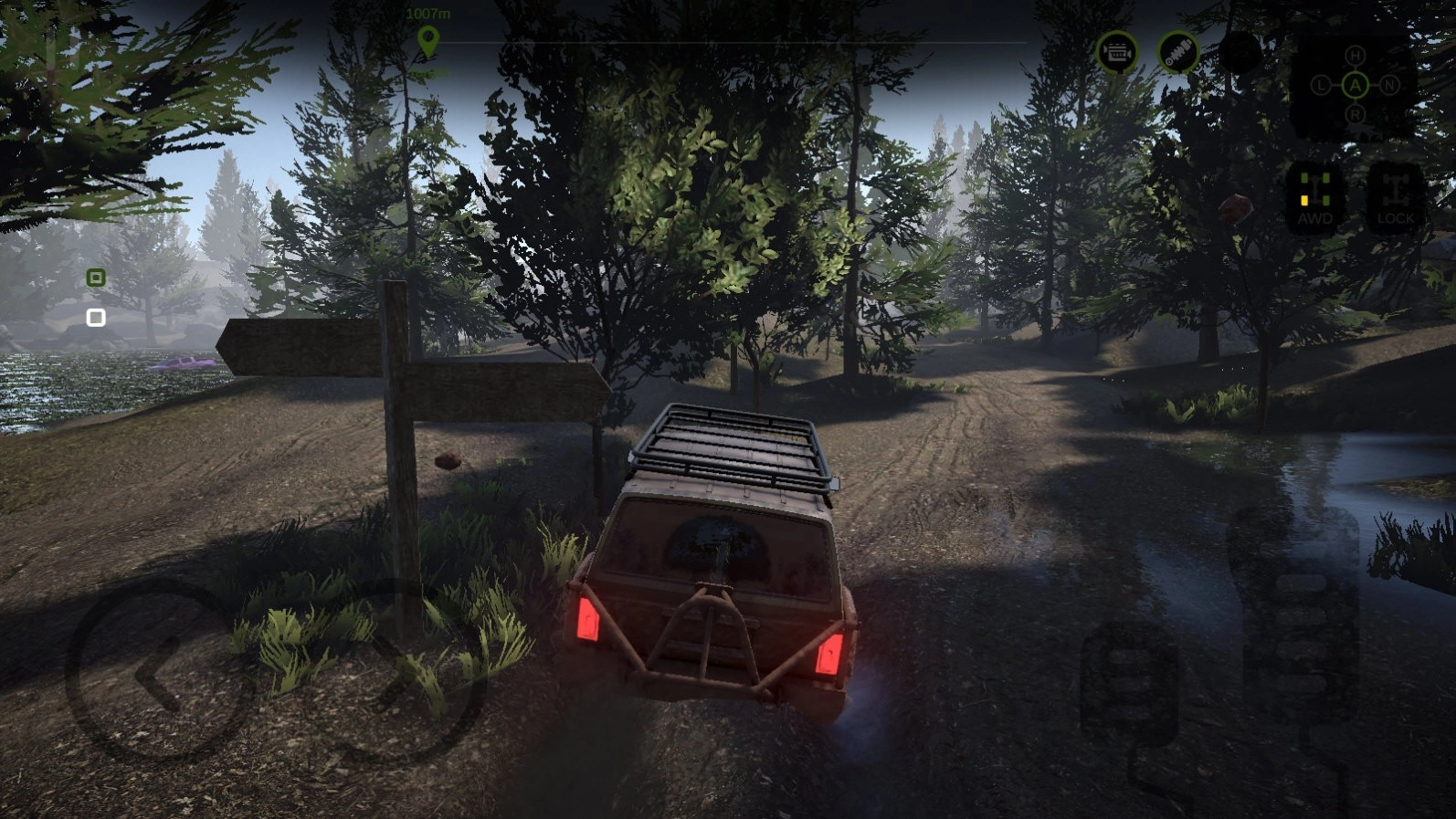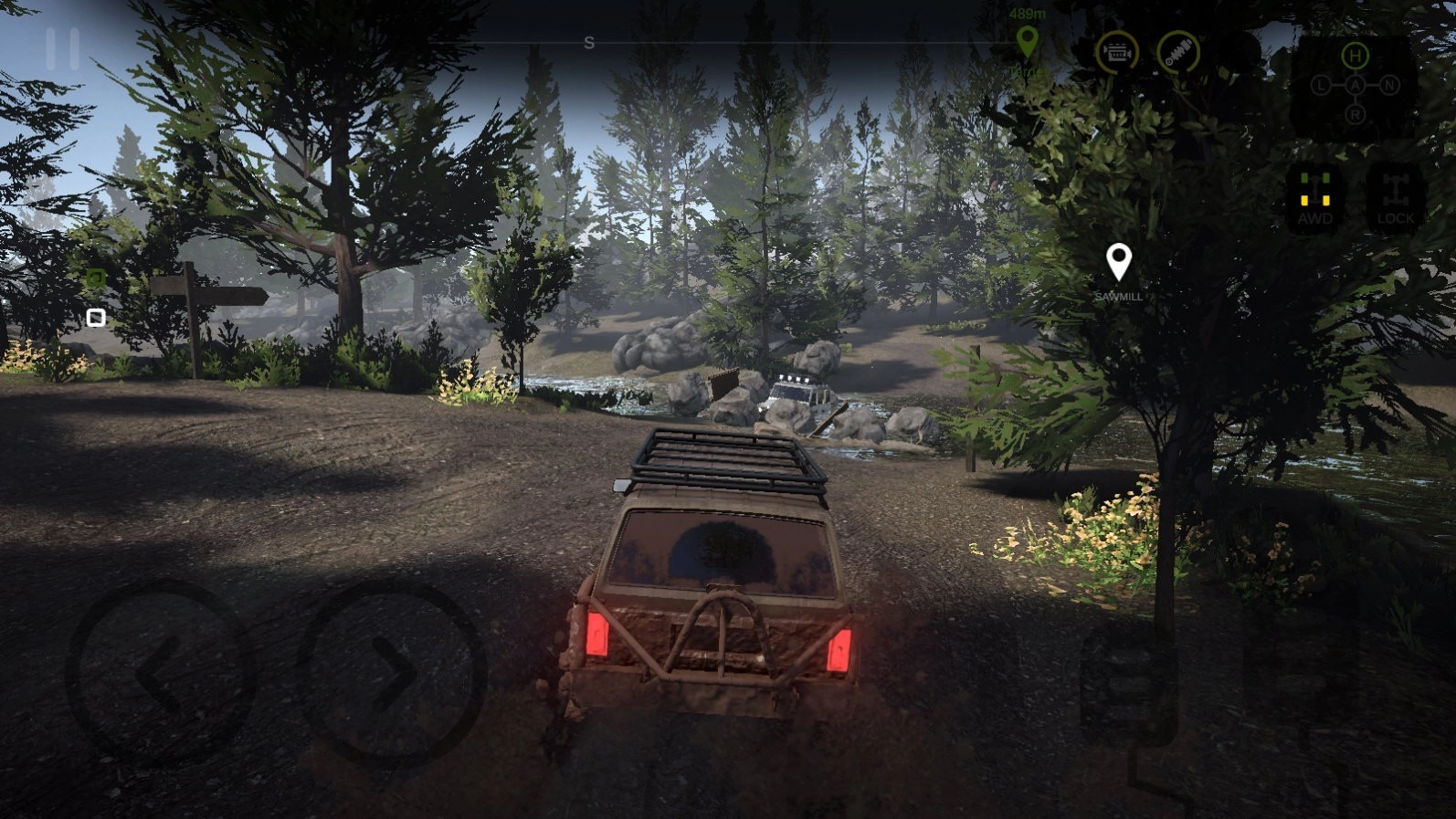 5、左下方的控制区域用于操控车辆左右移动,右下角的两个按钮分别对应后退和前进功能;界面顶部能显示车辆当前所处位置,右上角则会展示车辆轮胎的状态,一旦轮胎出现异常或损伤,该区域就会以红色进行提示。