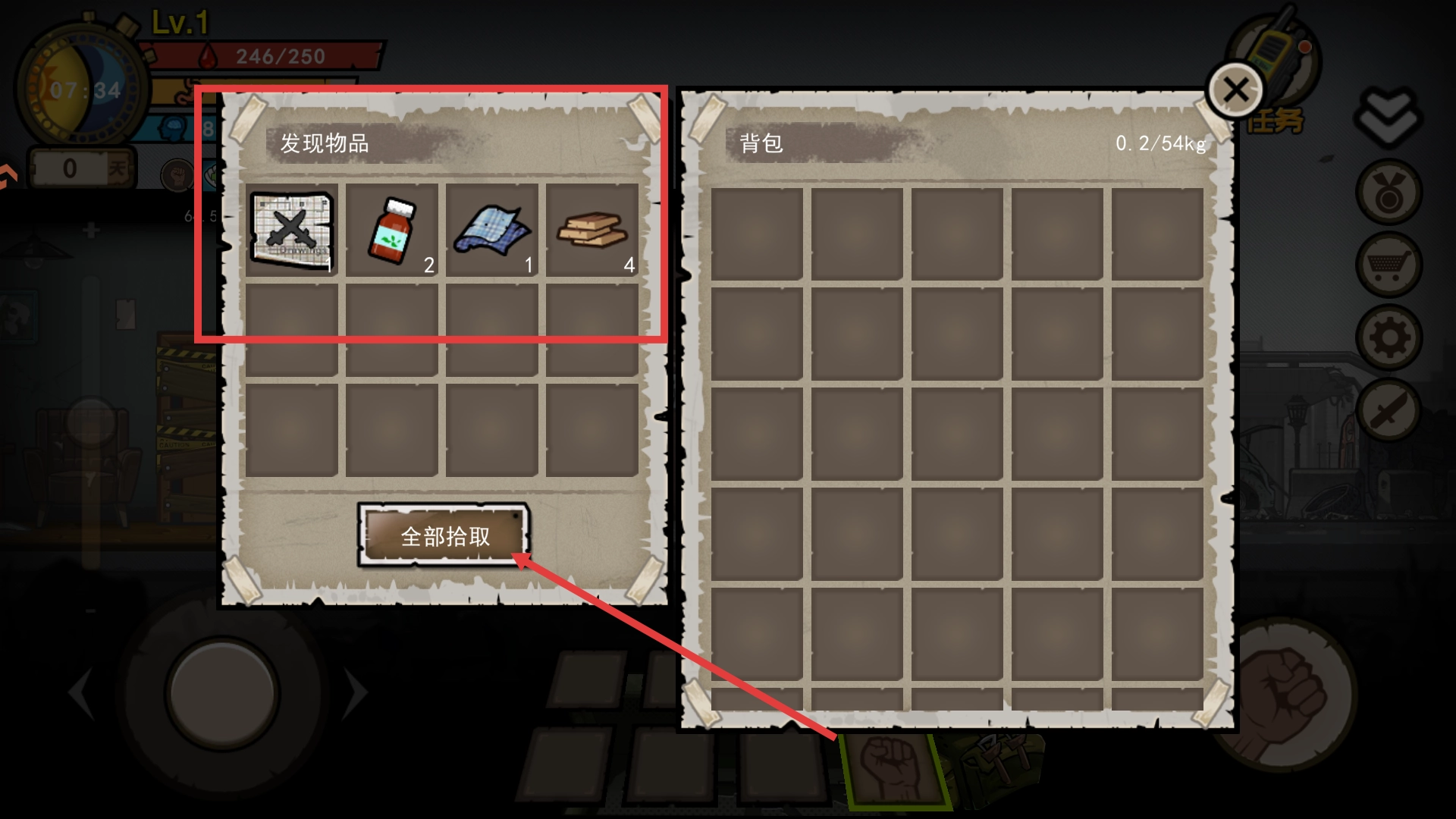 2、在探索过程中发现物资后,点击【全部拾取】按钮,即可获取【地图】、【药水】、【木板】等物品,为后续生存积累必要的资源储备。