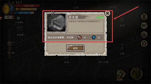 4、准备前往【安全屋】,需消耗【5】饱食度与【5】水分值,花费【30分钟】抵达该区域进行避险。