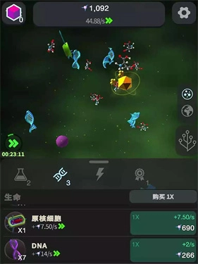 在微观世界里,玩家可以运用积累的「熵」,对已进化的物质进行升级,或是选择催生新的物质。像地球演化过程中出现的氨基酸、DNA、原核细胞、真核细胞等,都会在这个微观世界中呈现,玩家能够从不同角度观察这些物质的形态,进而知晓生命的形成历程。而在玩家探索新物质进化的过程中,「熵」的数量也会随之成倍增长。