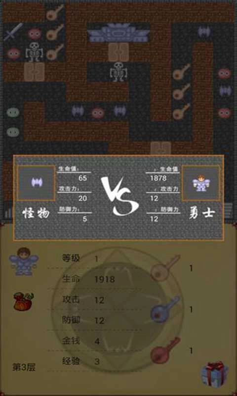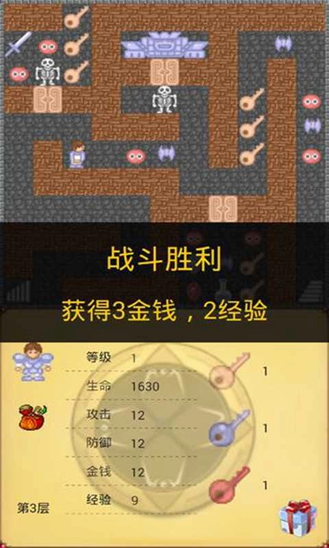击败上方的骷髅后去购买攻击属性(此举可减少骷髅一次攻击造成的伤害),返回第一层左侧击杀骷髅获取红宝石,接着战斗到第四层;在击杀第一只蝙蝠前再购买一次攻击属性(若金币不足,可返回第三层击杀红头怪物获取),随后回到第四层,击杀第一个骷髅并恢复生命值,再返回第一层击杀另一个骷髅,同时清空第三层的怪物,此时恰好可以再购买一次攻击属性。