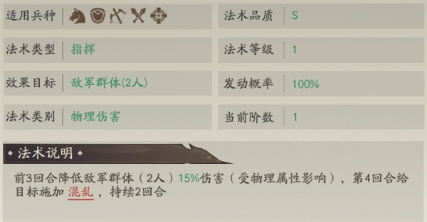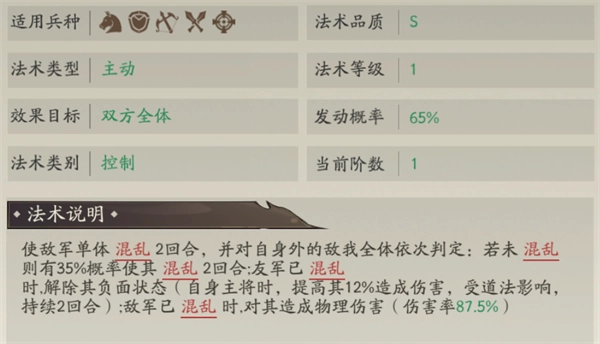 固有法术“神石横飞”能在前三回合降低敌人伤害,第四回合施加群体混乱效果,作为开局必触发的强力法术,可为孔宣创造输出空间,而第四回合稳定触发的群体混乱还能增强阵容的输出能力。法术“岿然不动”是辅助神将常用的强力法术,兼具控制与治疗效果。法术“方略无双”则可在攻击后触发友军补伤,强化主将的输出表现。值得注意的是,这两个主要增益法术均在战斗准备回合释放,不会受到孔宣固有法术的影响。