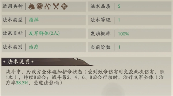 固有法术“风雨莫测”必然触发效果:为全队施加持续8回合的护命状态(受致命伤害时免疫1次),且在8回合内的偶数回合为全队治疗。该法术对长线战斗阵容增益显著,护命状态应对高爆发阵容时效果突出。法术“以屈求伸”可降低友军所受伤害。上述两个法术均在战斗准备阶段释放,不会受到孔宣固有法术的影响。“乌云压顶”能解除友军负面状态并进行治疗。整套法术组以恢复与保护为主,为主将输出提供可靠保障。