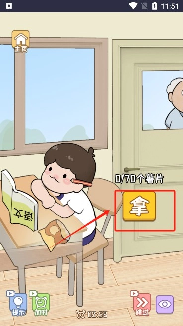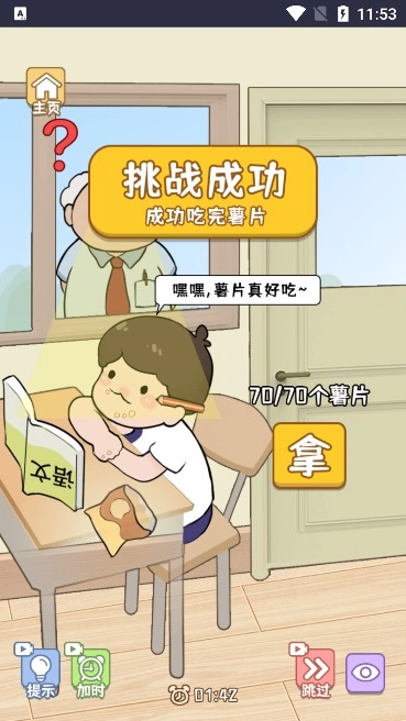 2、当老师移动到门后面时点击拿人物将会开始吃薯片