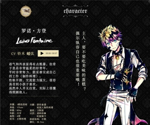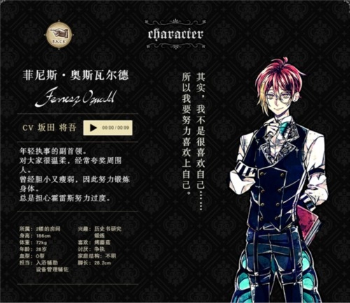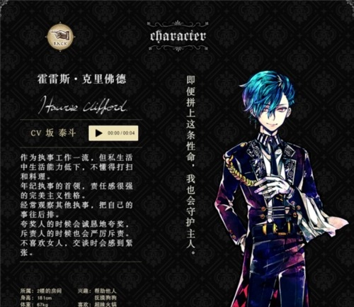 作为执事,他对自身的工作满怀自豪,也格外留意主人的日常起居,性情温柔又值得信赖,在其他执事当中很受认可。尽管他时常带着几分神秘感,可实际上他是个不喜欢张扬的人。