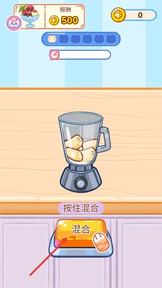 3、进入制作页面后,根据指引点击【混合】按钮,开展食材调配操作,以此完成观众的订单。