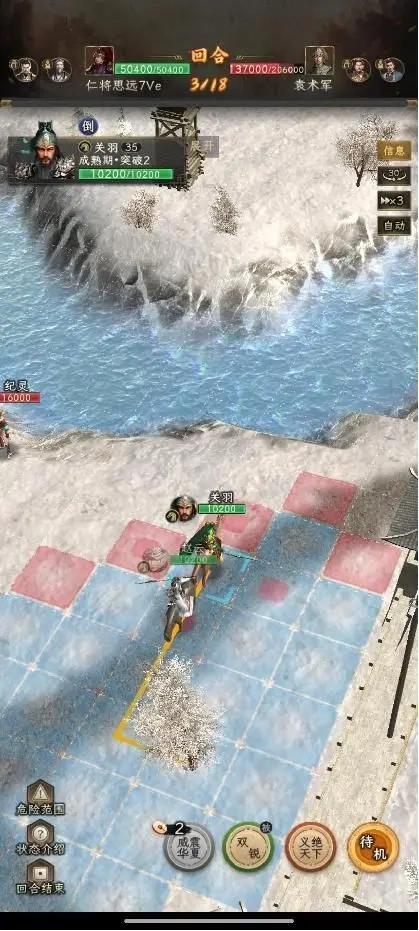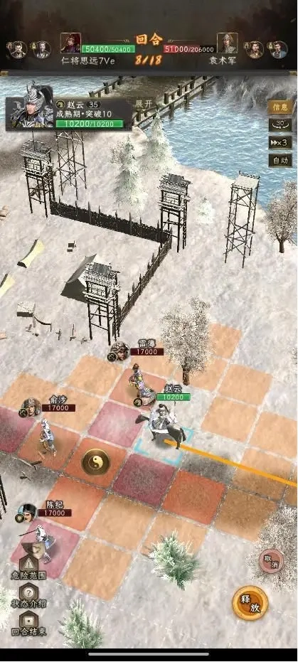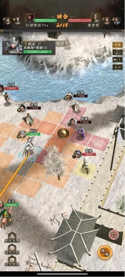 寿春对面有12名将领,AI处于发呆状态,只要不进入AI的攻击范围,它们就不会行动。对面的站位恰好有三个适合七进技能秒人的点位,便于逐个处理。对面物理防御最高的是纪灵,物防2061,血量1万6千,赵云单独无法秒杀,需要关羽配合补刀。其中俞涉需要留意,他有一个三格射程的弓兵技能,比常规危险范围多出一格,要避免不慎踏入他的技能范围。