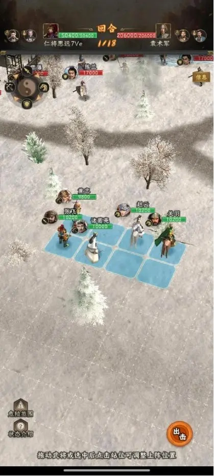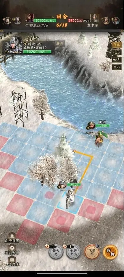 第七回合,赵云向下移动两格并释放怒气技能。需要留意这个站位——它恰好处于雷薄的攻击范围之外,同时也刚好在俞涉的技能覆盖范围之外。