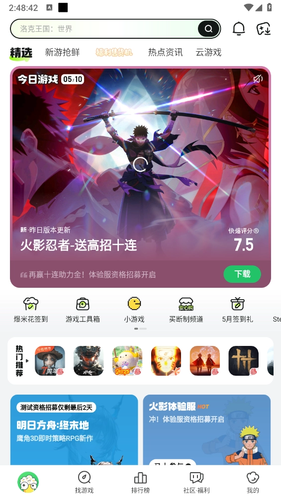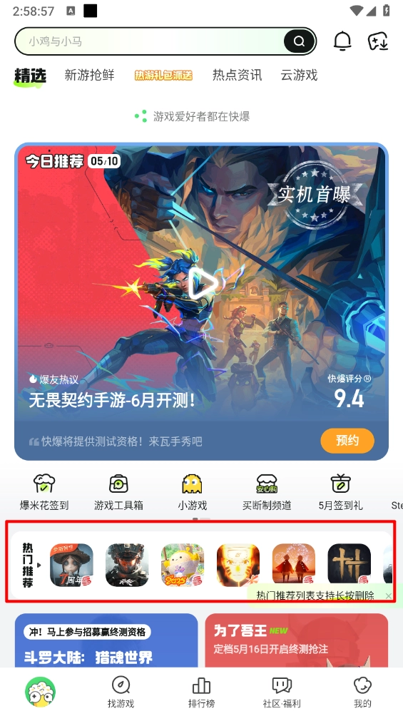 好游快爆最新版本是当下超火的游戏平台,在这里能抢先体验内测的优质游戏。无论是热门大作还是小众精品,平台上应有尽有。而且所有游戏都经过严格筛选,确保正版且安全可靠。此外,平台内的游戏社区提供攻略、视频、技巧等丰富内容,一应俱全,每天还能在社区里领取道具卡。
