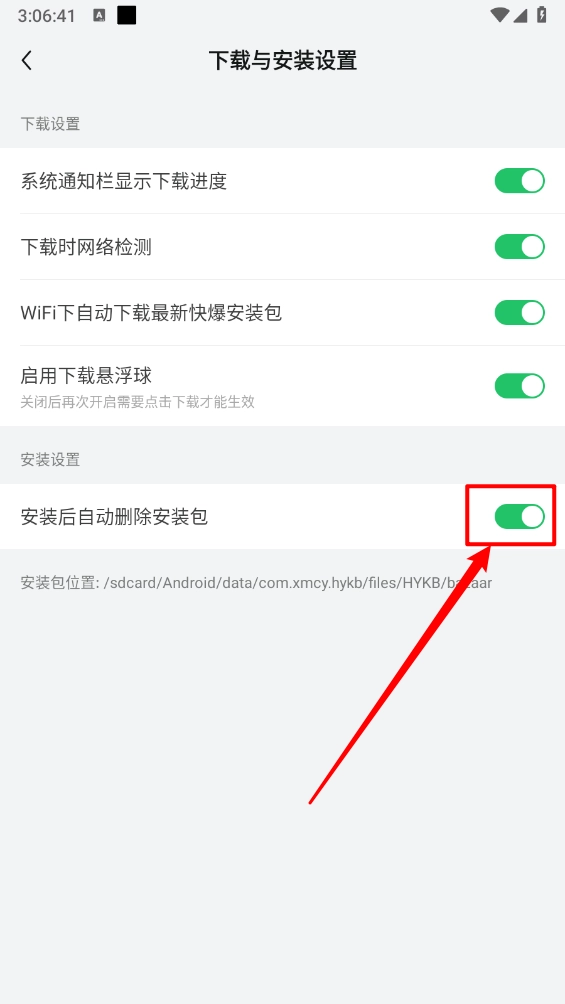 4、最后在该界面中开启“安装后自动删除安装包”的开关就可以了。