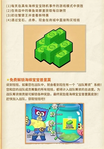 在海绵宝宝主题活动里,会推出专属的活动货币——【钱钱】,玩家可以用【钱钱】直接兑换强化道具与联动皮肤,其获取途径如下: