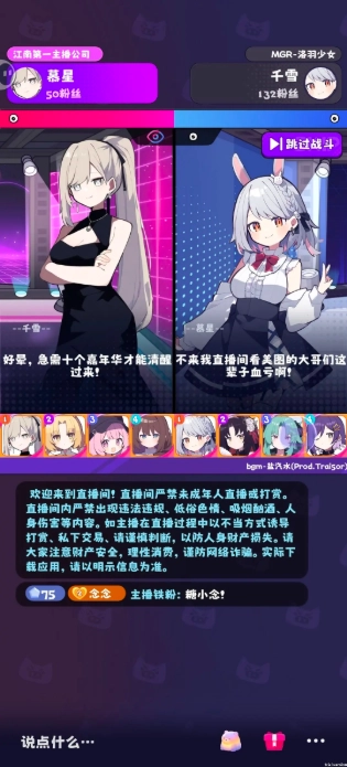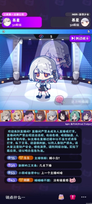 在江南这片地界,有个专门打造顶流主播的公司——江南第一主播公司,它推出了一款充满二次元趣味的养成经营游戏。在游戏里,你化身那位被称作“江南第一深情祖师爷”的王牌主播,在直播圈叱咤风云两年半后,下定决心创办属于自己的顶尖主播公司。你要用心培养旗下的美少女主播们,助力她们名气节节攀升,也让你的直播公司一步步成长,最终成为名副其实的江南第一主播公司!