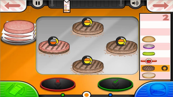 2、前往烧烤台煎制肉饼,肉的熟度需依据指针提示来判断,达到指定要求方可。