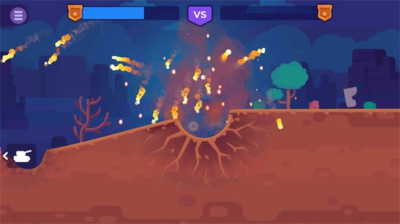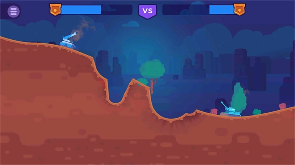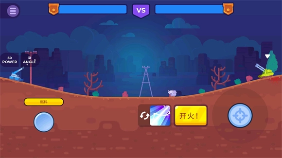 3、进入关卡后,点击左侧区域控制坦克移动,滑动右侧轮盘调整炮弹的发射角度与力度,点击开火按钮即可发射炮弹攻击敌方坦克。