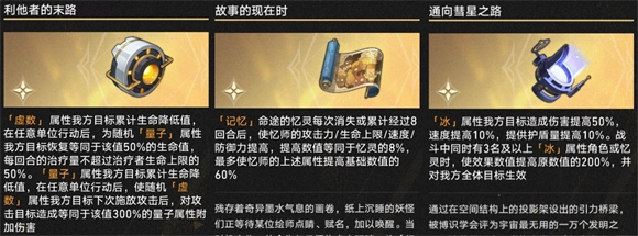 6、加权奇物推荐选择利他者的末路、故事的现在时、通往彗星之路这三个。其中利他者的末路尤为关键,只要队伍里配置一名(建议仅一名)虚数角色——优先选万敌,罗刹也可以——它就能把死龙的生命消耗再次转化为输出,效果差不多能达到小半个到小半个多纷争剧作家的水平,具体取决于该虚数角色能获得多少增伤加成。
