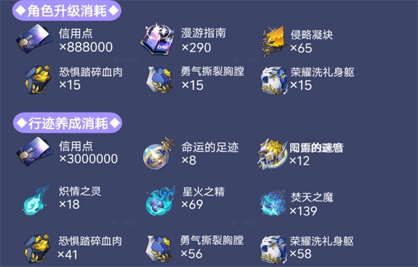 1、海瑟音的核心输出方式是给敌方叠加多种不同类型的持续伤害,此外,她的终结技具备引爆持续伤害效果、降低敌方防御、回复战技点等多重辅助增益作用,在一定程度上改善了当前持续伤害队伍面临的困境。该角色的养成材料消耗情况可参考图示。