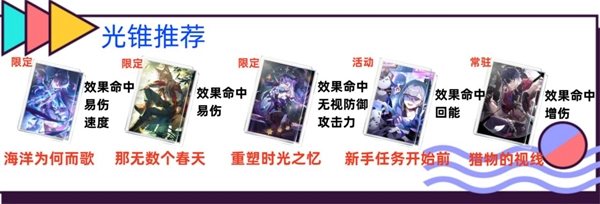 3、海瑟音对效果命中的需求较高,因此光锥推荐优先选择带有效果命中词条的,其中首推专武。最适配的当属专属光锥【海洋为何而歌】,它不仅提供了大量效果命中,还附带加速和dot易伤效果。其次可考虑椒丘的【那无数个春天】与黑天鹅的【重塑时光之忆】,这两把光锥也都带有可观的效果命中,前者侧重易伤加成,后者则具备无视防御的特性。四星光锥方面,【新手任务开始前】和【猎物的视线】是不错的选择,二者均包含效果命中词条,前者能提供回能效果,后者则针对dot伤害有增伤作用,可作为下位替代使用。