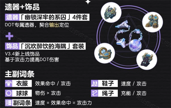 4、遗器饰品推荐选择幽锁4件套搭配海隅套。衣服建议选效果命中属性,鞋子可根据需求选速度或攻击力,位面球优先物理属性伤害提高,连接绳则选能量恢复效率。有效词条方面,重点关注效果命中、攻击力和速度这几项就可以了。