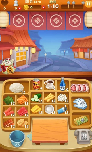 持续升级店铺的各类设施,打造专属于你的梦幻寿司小镇。灵活运用各种各样的道具,助力你顺利完成每一关,赢得全部的星星评价。
