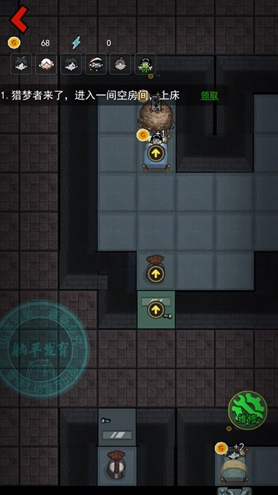 5、在倒计时5秒的时候升级床,然后升2级门,如果鬼先攻击我们,我们就建立武器,然后升级门,门快击破时可以点修复键
