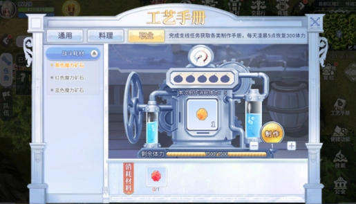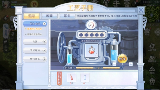 通用手册涵盖了药水合成、神奇道具、法术卷轴以及独特装备等各类制作配方。其中药水合成需收集相应材料与空瓶来完成制作,借此能够产出回复类道具。