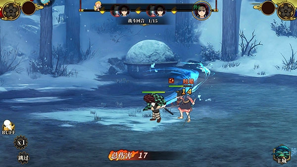 游戏战斗模式为挂机自动战斗,左下角设有增益buff按钮可随时点击使用,同时建议开启倍速功能以提升战斗效率。