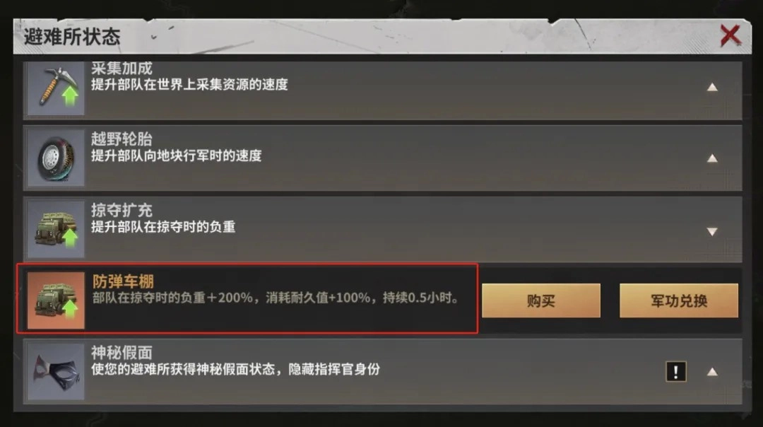 另外,使用【防弹车棚】这一道具能够显著增加掠夺过程中的负重上限,从而有效提高掠夺效率。