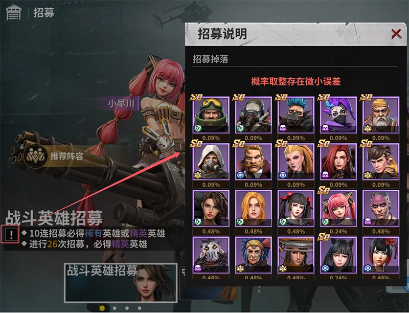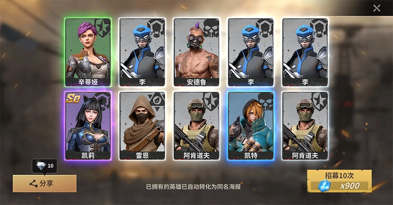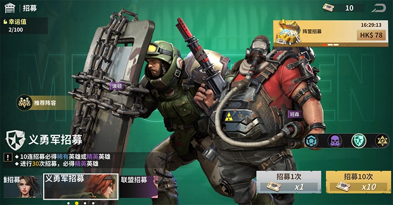 点击【招募】按钮有机会随机获取英雄角色。若招募到已拥有的英雄,该英雄将自动变为同名海报道具,可用于提升英雄的等级或品质。