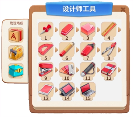 获得四级背包里的工具后,就能着手合成设计师工具了:2个图钉可合成1块橡皮擦;2块橡皮擦能合成1叠便笺;……以此类推。