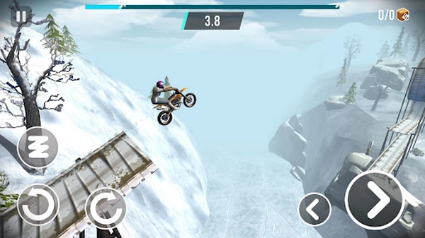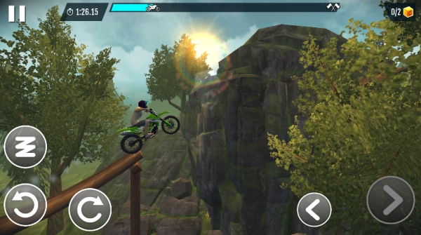 进入游戏后,屏幕左下方的两个虚拟按键负责操控摩托车的前倾与后仰,帮助玩家精准调整车身姿态;右下方的前进与后退按钮则可相互配合,让摩托车在复杂地形中也能稳定行驶。