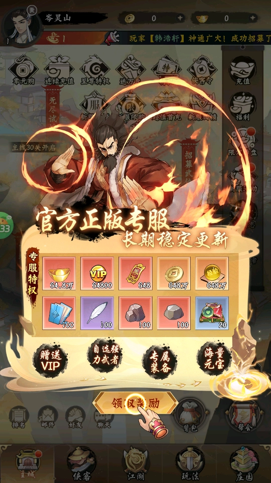新手刚上线就能领取丰厚福利,像元宝、铜币和VIP经验值这类资源都包含在内,能帮你更快成长;