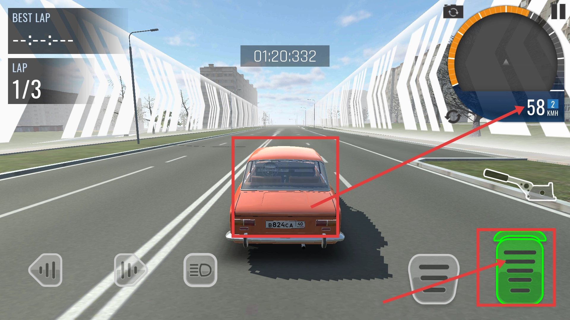 驾驶时借助右侧的油门键来把控车速,比如要维持【58-KMH】的稳定行驶状态;左侧的方向键用于调整行驶方向,同时需留意【1/3】的圈数进度。