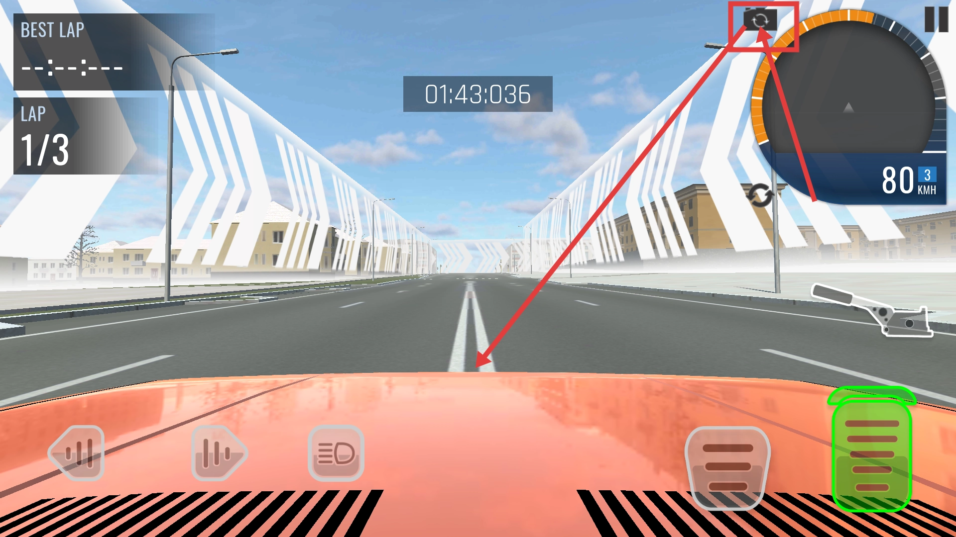 比赛过程中,你可以点击视角切换按钮来调整视角,同时保持像【80-KMH】这样的车速,通过优化驾驶视野来提高比赛成绩。
