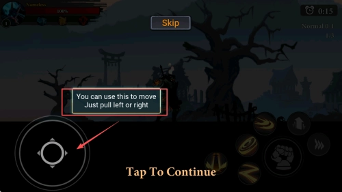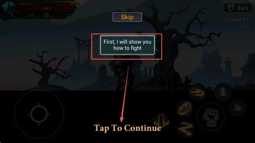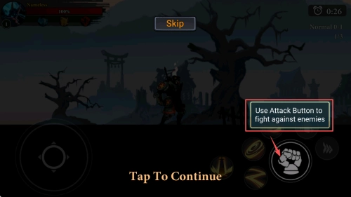 攻击操作:了解如何运用右下角的攻击按钮来和敌人作战,点击“Tap To Continue”即可继续教程。