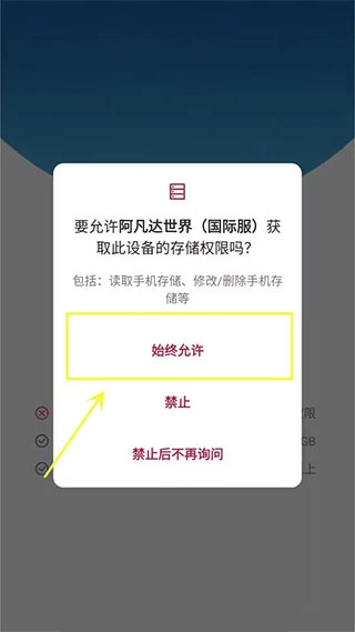 ①打开已安装好的游戏后会弹出安装器,此时会提示需要“储存权限”,请点击【始终允许】按钮。