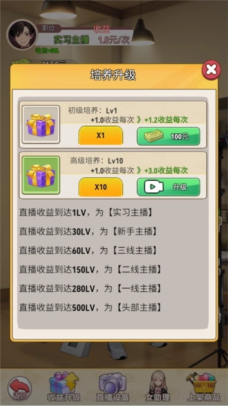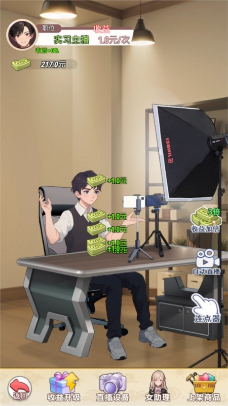 2、多种直播设备可供挑选,通过直播表演赚取资金,用于升级装备;