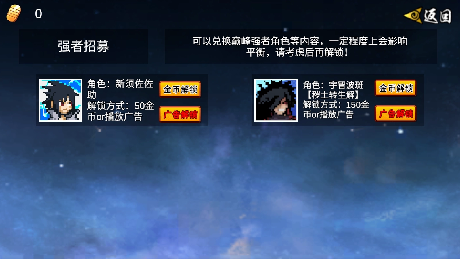 所有巅峰强者角色,解锁方式支持消耗金币或者观看视频广告。