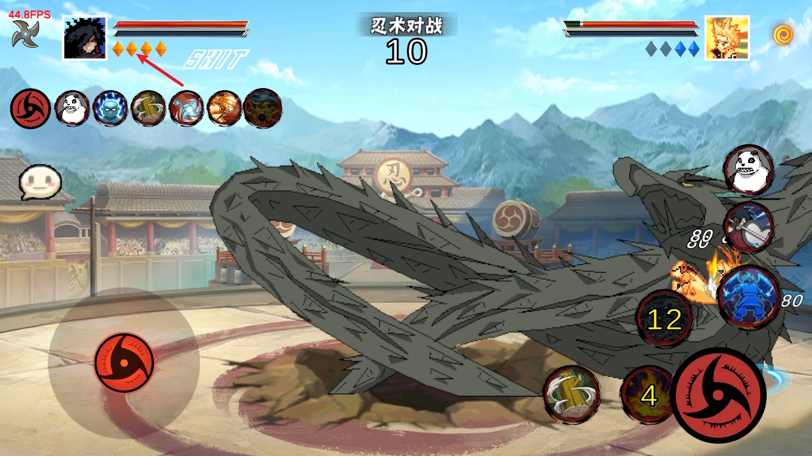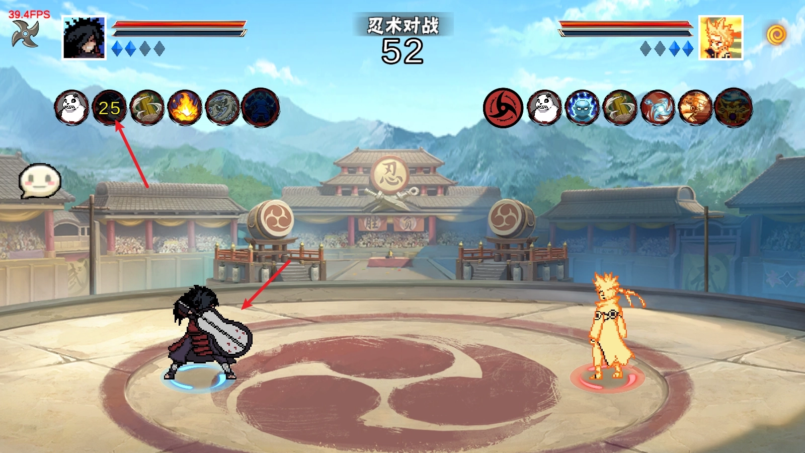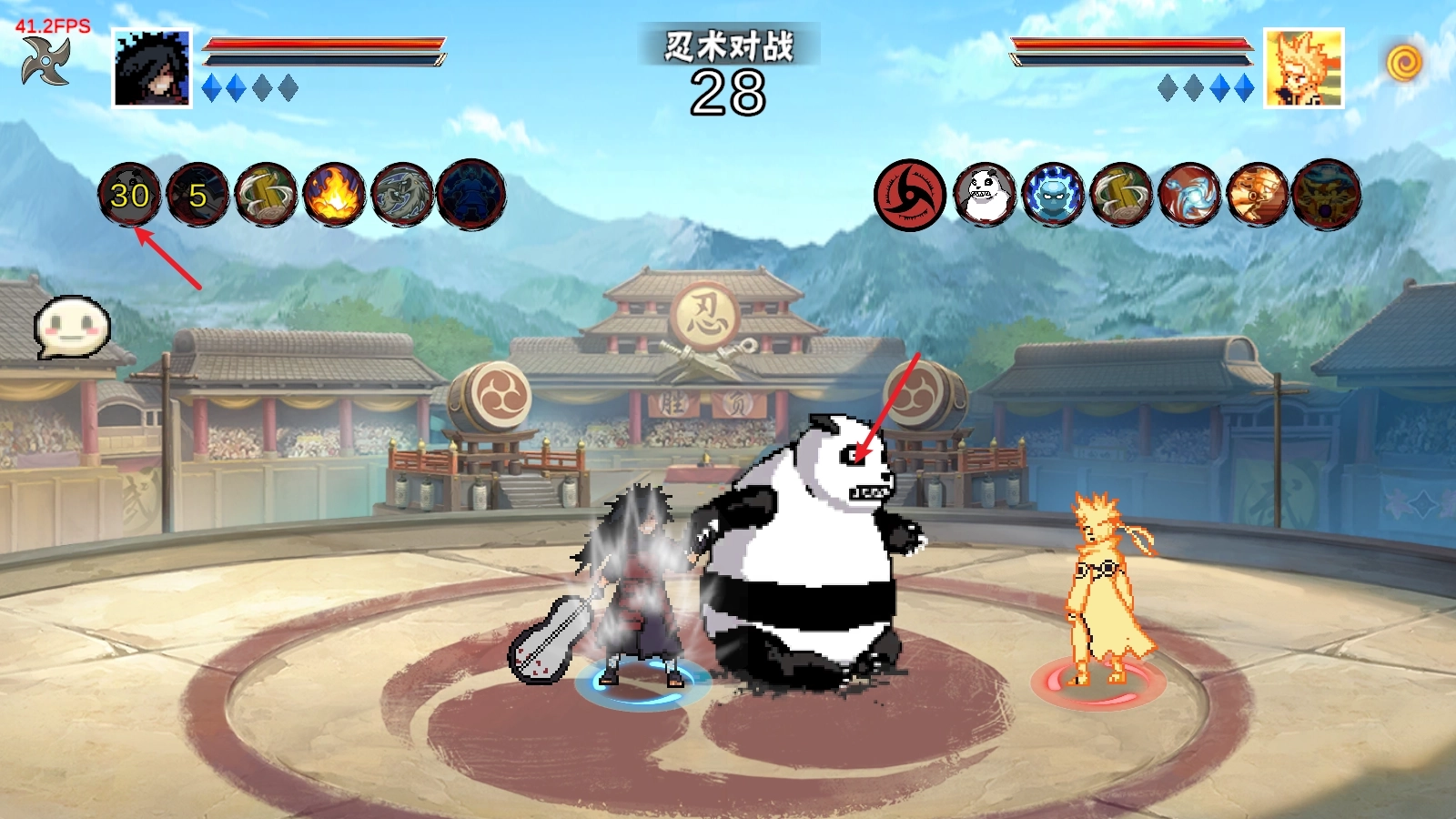 4、每个忍者都有两个小技能和一个奥义技,释放技能后会进入冷却倒计时(部分角色拥有子技能或技能的二段变化)。