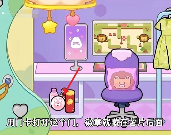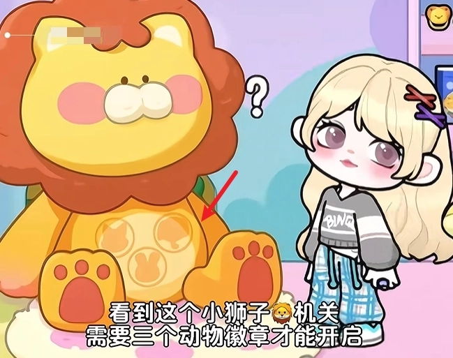 1、来到幼儿园的场景里,找到一只带有徽章提示的狮子玩偶,它得集齐三枚神秘徽章才能解锁奖励,此刻正等着呢。