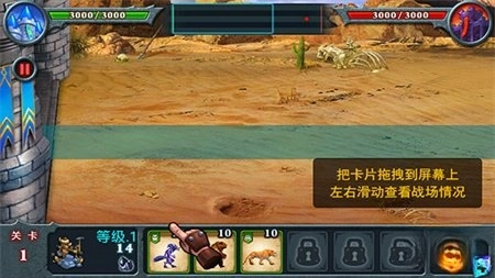 3、把卡片拖到屏幕上就能开启战斗,左右滑动屏幕可以查看战场状况。