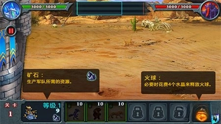2、矿石是军队生产所需的资源,必要时,你可以消耗4个水晶释放火球。